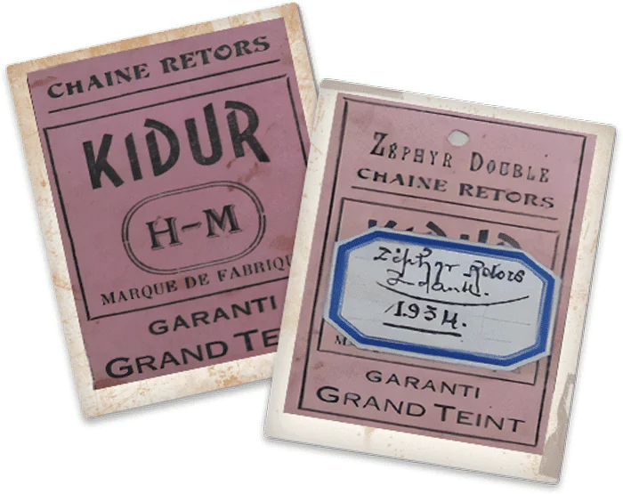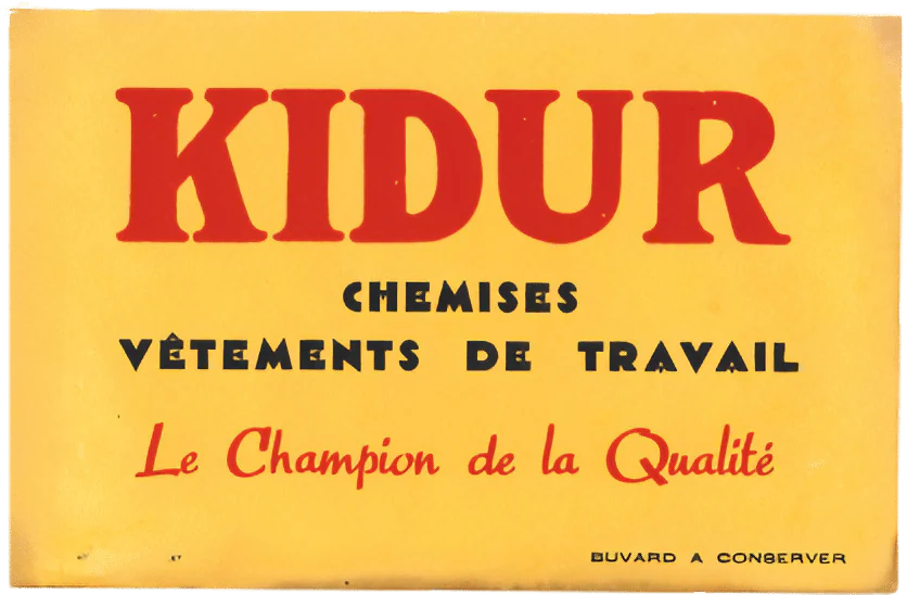 Juste & René se sont progressivement fait connaître pour la qualité de leurs fabrications. Des tissus qui durent, des tissus qui résistent à l’usure et dont la couleur tient au lavage. Ces matières permettaient de confectionner des vêtements Made in France solides, de très bonne qualité qui résistaient très longtemps à l’usage (condition essentielle en ce temps là) Progressivement “QUI DURE” se transforme en KIDUR. Et c’est au détour d’une couverture de la collection de 1934 qu’on voit pour la première fois apparaître la marque KIDUR.