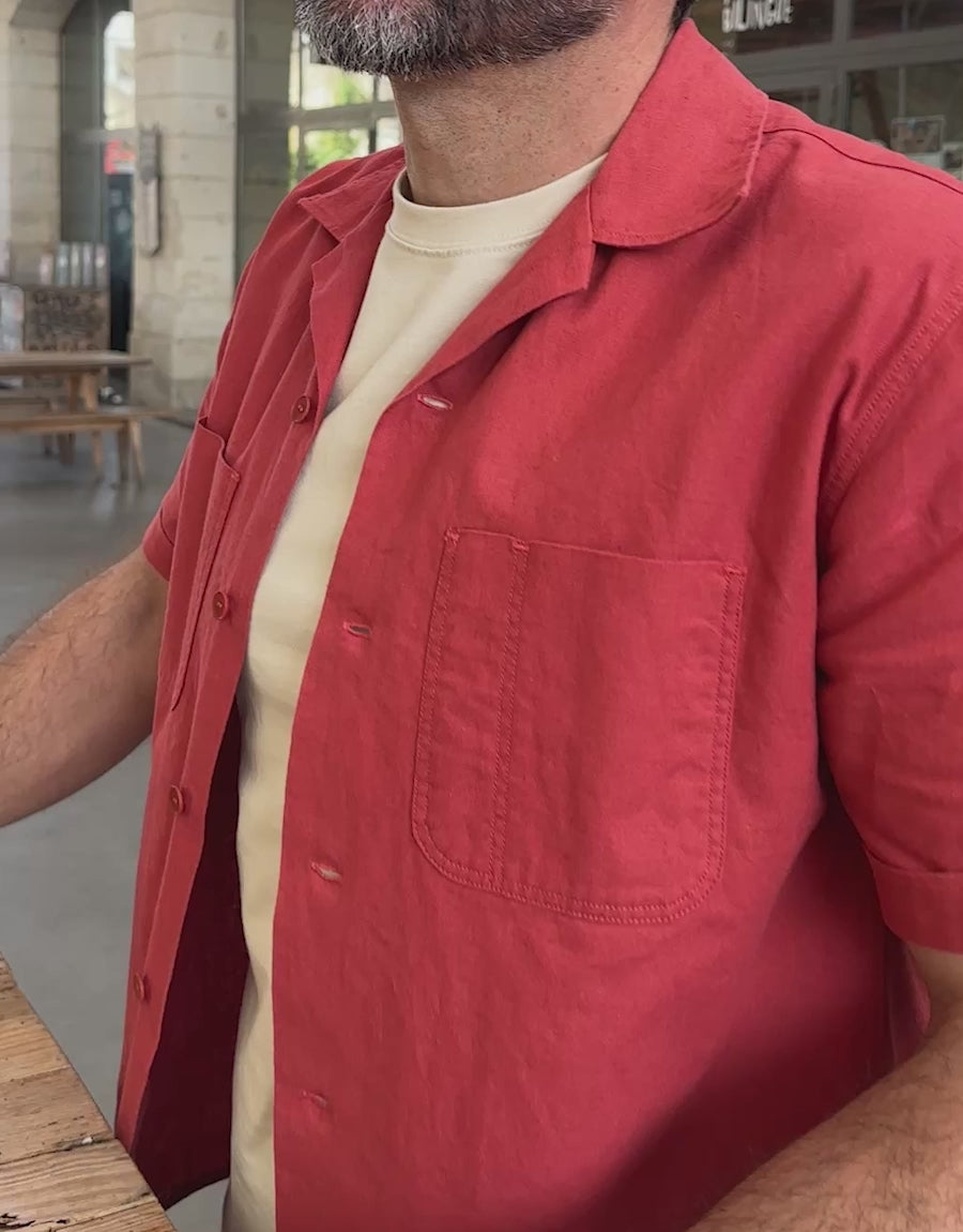 Notre chemise Caviste se caractérise par son bas droit, porté hors du pantalon avec élégance. D’une coupe assez large et décontractée et d’un col ouvert type “Camp Collar”. La caviste propose 3 poches et des manches courtes finies par un revers piqué.