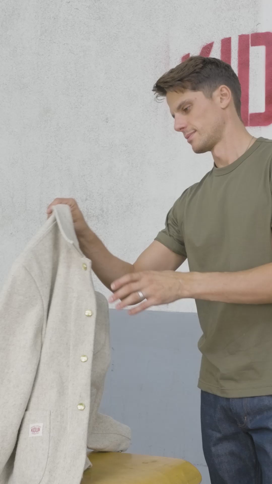 Sa coupe droite, ses poches plaquées généreuses et ses finitions solides reprennent l’esprit utilitaire de Kidur, adapté à un usage contemporain. Le lainage, avec sa texture dense et chaleureuse, apporte un caractère unique qui enrichit cette silhouette intemporelle.