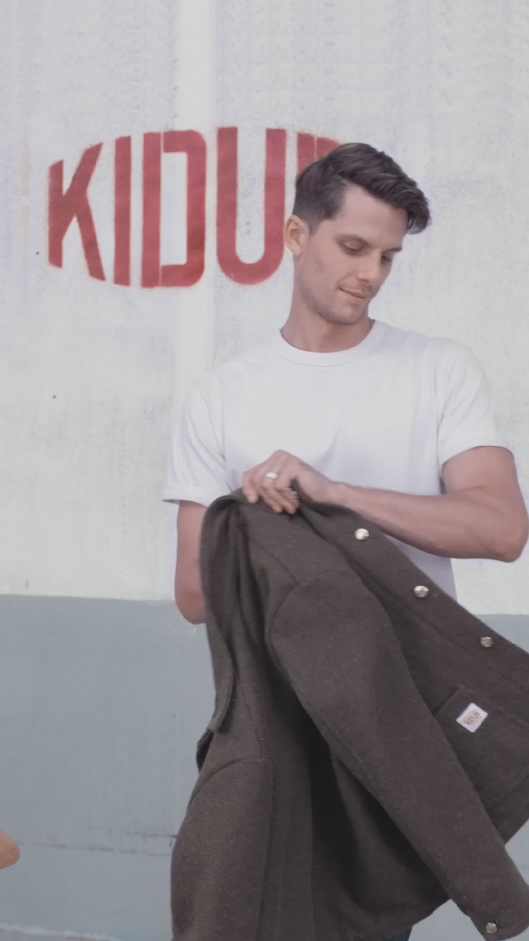 Sa coupe droite, ses poches plaquées généreuses et ses finitions solides reprennent l’esprit utilitaire de Kidur, adapté à un usage contemporain. Le lainage, avec sa texture dense et chaleureuse, apporte un caractère unique qui enrichit cette silhouette intemporelle.